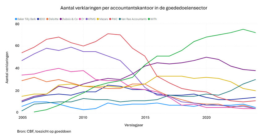 “Uit onze database blijkt dat er verschuivingen zijn voor wat betreft accountantskantoren die verklaringen afgeven aan goede doelen,” zegt Gerjob Lootens, manager Data, Onderzoek en Ontwikkeling bij het CBF. “De grootste accountantskantoren hadden veelal een eigen goede doelen desk en gaven veel verklaringen af. Klanten waren geclusterd bij accountants die de sector goed kenden. Zij waren expertisecentra, eigenlijk. Dat is in 15 jaar tijd veranderd: in 2009 gaven zij nog 186 verklaringen af aan goede doelen, ten opzichte van 23 over verslagjaar 2024, een afname van 88%