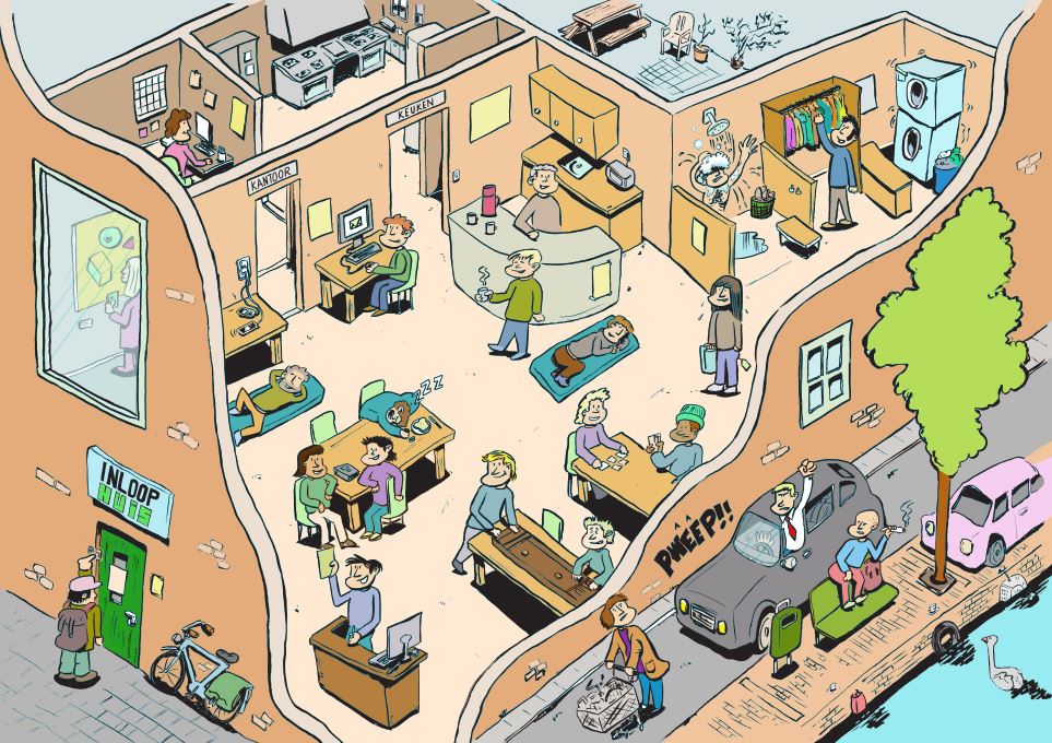 - Er zijn 12 inloophuizen, waar dak- en thuislozen gezond eten, een douche en schone kleding krijgen, en hulp van de maatschappelijk werkers.